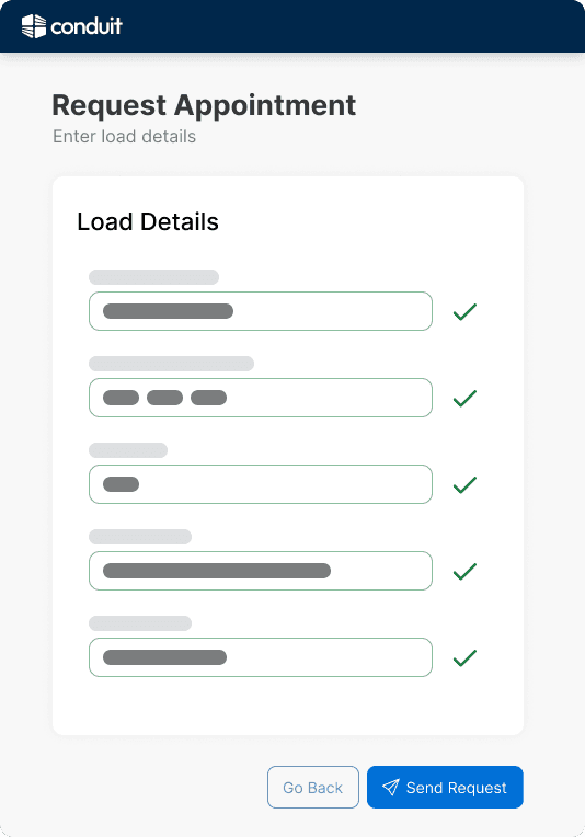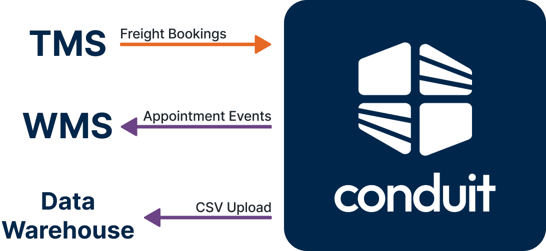 You expect your warehouse team to communicate and work well together. You should expect the same from your warehouse software. Conduit's infinite API integration layer can connect to any logistics software, like WMS, TMS, YMS, or ERP. As changes happen throughout your supply chain, appointment updates flow to and from Conduit to keep your operations running smoothly with less effort.